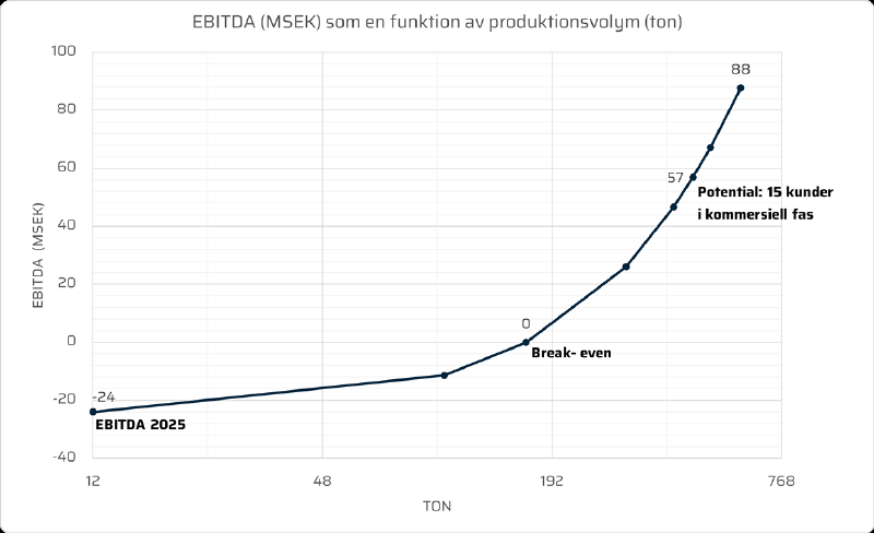 Grafen illustrerar det beräknade sambandet mellan produktionsvolym och EBITDA. Vid en produktionsnivå på cirka 160 ton förväntas bolaget nå break-even, på EBITDA-nivå. Därefter beräknas lönsamheten förbättras om produktionen fortsätter att öka, vilket ger en god operativ hävstång där resultatet förbättras i takt med högre produktionsvolymer. Den uppskattade potentialen för bolagets 15 kunder i kommersiell fas uppgår till cirka 450 ton per år, vilket enligt Bolagets beräkningar, motsvarar en EBITDA över 50 MSEK.
